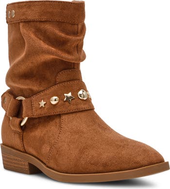 Mixed studs and a glinting harness buckle highlight the slouchy profile of a faux-suede bootie featuring a square toe and low, stacked heel.