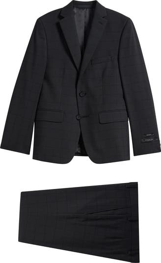 Grey-black coloring patterned in a windowpane check keeps your child looking dapper at any formal occasion in a two-piece suit that's made with a touch of stretch for easy-wearing comfort. The skinny tailoring and flat-front trousers add timeless detailing to the crisp, polished finish.