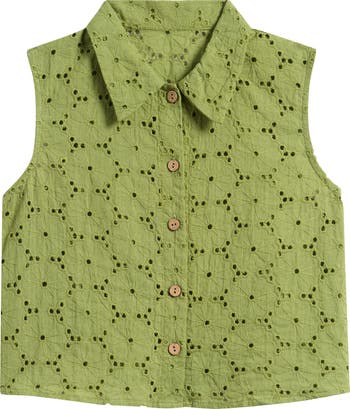 They'll love the tonal embroidery that details this all-cotton button-up shirt made in a layerable sleeveless silhoeutte.