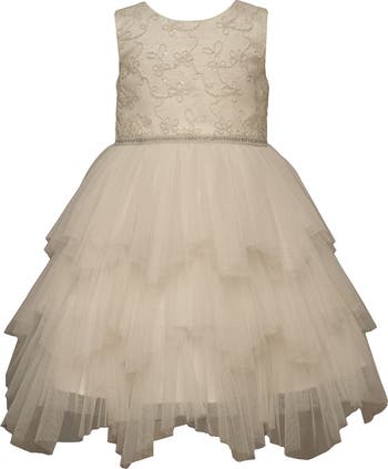 Sequined embroidery makes a stunning statement on this festive dress complete with an airy tiered skirt.