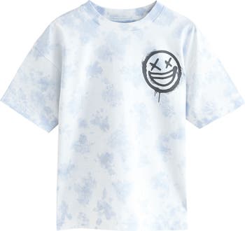 A blue-sky tie dye provides a happy background for the graffiti smile stamped on this all-cotton T-shirt.