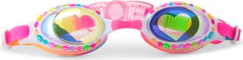 Bright heart-shaped lenses and smiley-faced gems bring cheerful charm to these comfy goggles built with antifog clarity for every splash.