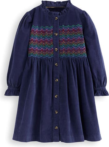 A delightful long-sleeve dress is textured in soft corduroy and smocking at the bodice defined by rainbow stitching for playful charm.