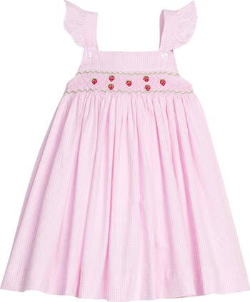 - The Lizzy D Dress features tank top straps with ruffles that button at the chest. With beautiful smocking at the chest and colorful embroidery, this dress is sure to be a favorite!