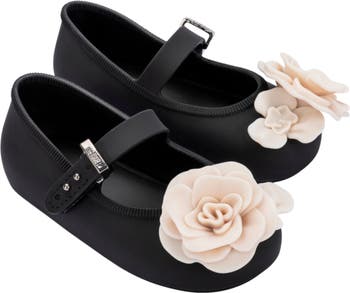 Large floral appliqués and signature fruit-scented PVC add to the fun of this cushy mary jane flat sized just for kids.