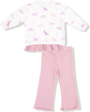 A herd of dinosaurs lend kid-approved fun to a French-terry top paired with ruffled, flared leggings to keep them comfy and cozy.