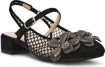 A padded footbed keeps little feet comfortable as they dance and party in this fishnet-inspired dress shoe topped with sparkling flower appliqués.