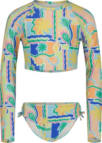 From the shores to the shallows, this one-piece swimsuit blocks out the sun, sand and surf to keep them splashing happily with its long sleeves and full coverage.