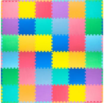 The ProSource Kids Solid Puzzle Play Mat creates a brightly colored, comfortable and safe play area for children wherever you have hard floors. Colorful puzzle pieces and borders will help promote your baby’s brain growth and development, making it ideal for homes, child care providers, schools and churches. The gently textured surface provides a non-slip grip for extra safety and the 3/8-inch thick high-density EVA foam provides durable cushion for your child. It’s also water-resistant, making it easy to clean and keep free from odors. It covers a total of 36 square feet when fully assembled or if you prefer a smaller piece to make it convenient for your space, the 16 square feet can accommodate your needs when fully assembled. The mat can be customized by using only some of the tiles for smaller areas, or by purchasing an extra set to create a larger play area. Each tile is approximately 12 square inches and it comes with 24 border pieces for a finished look. Soft but firm interlocking pieces are easy and quick to assemble or take apart in case you need to quickly store it away or move it to another room. The lightweight play mat comes in a zippered bag which you can keep to transport or store your mat. This mat does not contain any toxic phthalates.