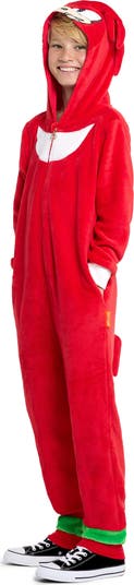 Knuckles the Echidna inspires and brings energy to this one-piece hooded jumpsuit that's great for Halloween or just hanging out on the sofa.