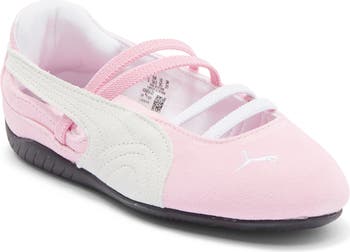 An extended topline bridged with bands of soft elastic brings ballet-inspired detailing to to a kid-size sneaker that started life as a sleek, low racing shoe. A curvy Formstrip floating against the open side and a PUMA Cat embroidered on the toe keep the pedal to the floor for a fan-favorite win.