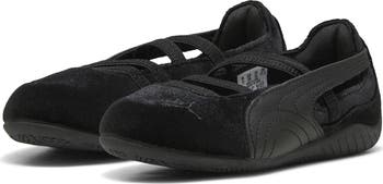 An extended topline bridged with bands of soft elastic complement the ballet-inspired detailing of a velvet-wrapped sneaker that's sized for kids and designed with details from its origins as a racining shoe. A curvy Formstrip floating against the open side and a PUMA Cat embroidered on the toe keep the pedal to the floor for a fan-favorite win.