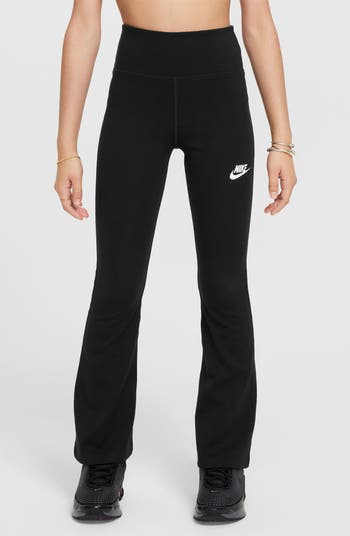 Flared legs add to the fun of these high-waist leggings that are stretchy enough to keep up with your sporty kid's every move.