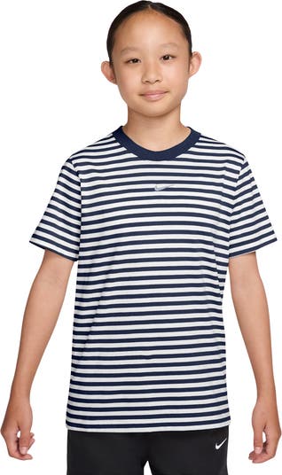 A metallic Swoosh brings a glint of signature sporty style to this classic striped T-shirt made just for kids.