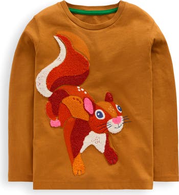 Your child will want to keep some nuts handy for the fuzzy bouclé squirrel that looks ready to spring from the front of this long-sleeve cotton T-shirt.