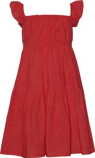 They'll love to twirl in this tiered cotton party dress made with tonal eyelets shaped like stars and framed by frilly flutter sleeves.