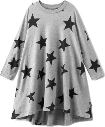 An allover star print adds a bit of rock 'n' roll attitude to a long-sleeve cotton dress fashioned with a swingy high-low hem.