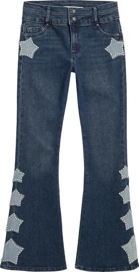 Stud-framed star appliqués bring striking style to these flare-leg jeans made from stretchy denim that will keep cool kids comfortable all day long.