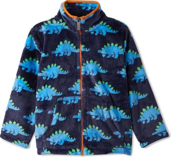 Soft, plush fleece covered in colorful dinos revs up the comfort of a jacket fitted with front pockets to keep your little one's hands warm in the cold.
