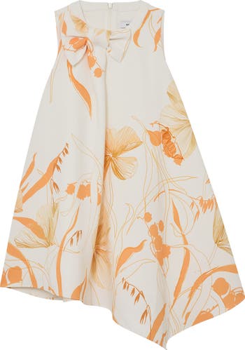 Your young trendsetter can make a high-fashion entrance in this statement-making party dress cut in a dramatically flared trapeze silhouette with an asymmetric hemline. A bow-popped neckline and abstract floral pattern sweeten the look.