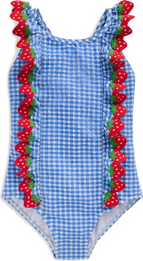 Kids' Strawberry Appliqué Ruffle Seersucker UPF 50+ One-Piece Swimsuit
