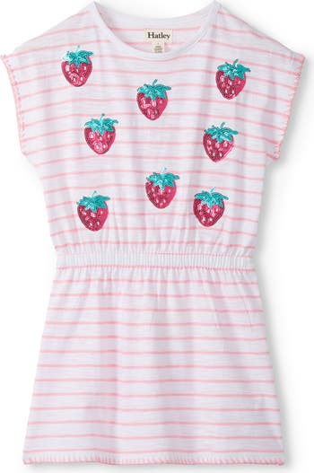 A stretchy waist cinches this tot-sized dress that's all cotton, striped and sweetened with sparkly sequin strawberries.