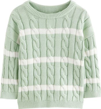 Cables and ribs alternate on a soft cotton crewneck sweater that's wrapped in stripes for a little extra zing.