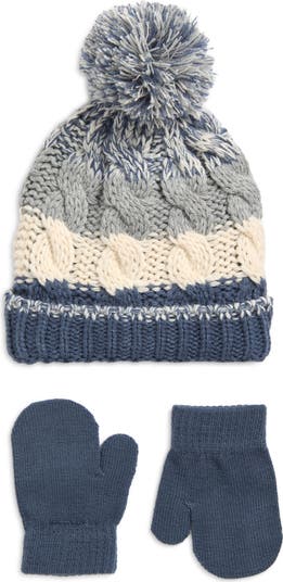 They'll stand out even on the greyest of days in this cable-knit beanie decorated with chunky stripes and a fluffy faux-fur pompom. Soft gloves complete the cozy, picture-perfect look.