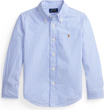 Perfectly puckered cotton seersucker patterned in traditional pinstripes makes a warm-weather favorite of a shirt that's sized for kids and topped with a buttoned collar to add a smart finish to the relaxed feel. It looks great on its own, layered and open, tucked, or untucked to match any occasion and any child's sense of style.