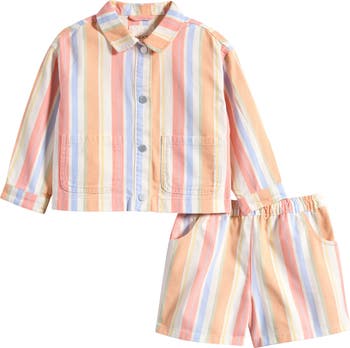 Sherbet-hued stripes bring a lighthearted feel to this matching cotton twill jacket and shorts set fashioned with a cute Peter Pan collar and enameled snaps.
