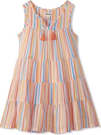 Metallic threads add the perfect touch of sparkle to this colorful striped dress with playful tassles at the split neck.