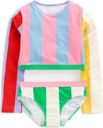 Young beachgoers will love to splash and play in this boldly striped two-piece swimsuit made with long sleeves that block out the sun, sand and surf.