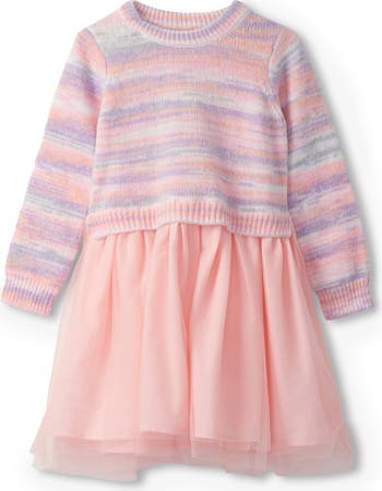 A fuzzy pastel-striped sweater tops a flouncy tulle skirt in a dress with two-piece look that will keep your young partygoer nice and cozy.