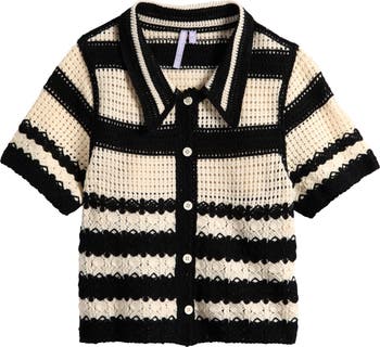 A mix of open-stitch knitting styles gives a cool crocheted look to a striped button-up top your child will love for layering.