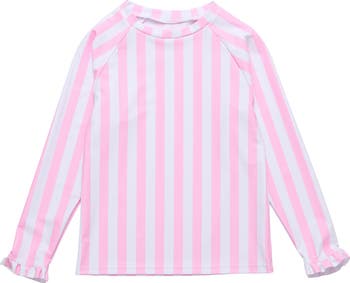 Playful ruffles and stripes complete the instant-favorite appeal of this long-sleeve rashguard in a stretchy UPF-protective design for all-day fun in the sun.