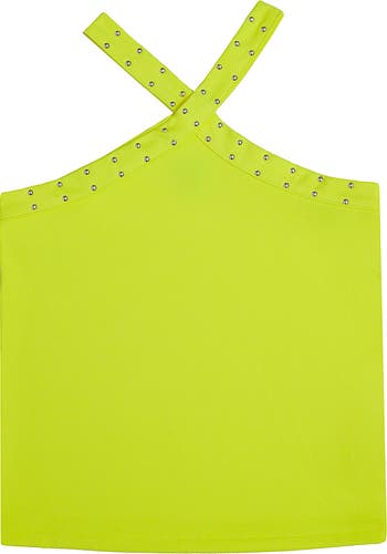 Polished studs highlight the neckline and crossover straps of this stretchy tank that will have your kid looking bright.