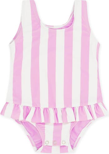Retro stripes race down this flippy one-piece swimsuit that's stretchy and quick-drying, too.