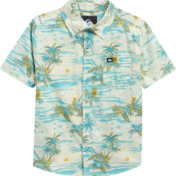 Keep your little beach bum looking sharp in this lightweight stretch-poplin shirt featuring a tropical print and the Aussie brand's Omni logo—a nod to Quiksilver's roots in surf and mountain sports.