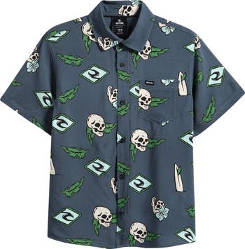 Silky-soft viscose covered in skulls and waves keeps the conversation going in a shirt that's sized for kids and topped with a smartly pointed collar. It looks great smooth, rumpled, tucked or untucked to match any child's sense of style.