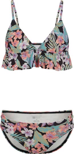 They'll love jumping in the water and lounging poolside in this ruffle-trimmed two-piece swimsuit featuring a playful tropical print.