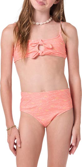 Get your kiddo ready to catch a wave in this two-piece swimsuit featuring a tie-front bikini top and matching bottoms.