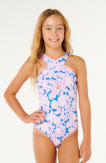 They'll be feeling confident as they dip and dive in this ribbed one-piece swimsuit featuring a strappy low back and a sprawling floral print.