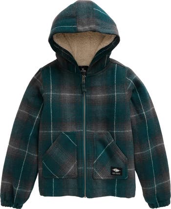 A fuzzy fleece-lined hood will keep your child's head extra cozy in this zip-up jacket rendered in a blurry plaid.