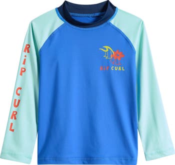 Stretchy, UV-blocking fabric made in part with recycled fibers keeps your kid comfortable in and out of the water in a rashguard designed with a tagless interior to help prevent chafing. Long raglan sleeves and a higher mock neck offer added protection against sunburn and the occasional bumps during splash time and playtime.