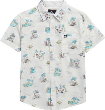 Soft, breathable cotton covered in beachy doodles makes a sunny-day favorite of a shirt that's sized for kids and topped with a smartly pointed collar. It looks great smooth, rumpled, tucked or untucked to match any child's sense of style.