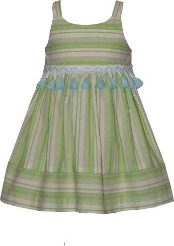 This verdant hued dress woven from a lightweight cotton blend is detailed in pretty blue tassels.
