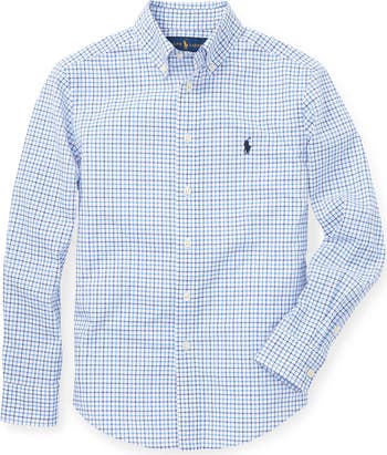 A tattersall pattern in blue hues refreshes a cotton-poplin button-down shirt with a crisp and preppy look perfect for your sharp-dressed child.