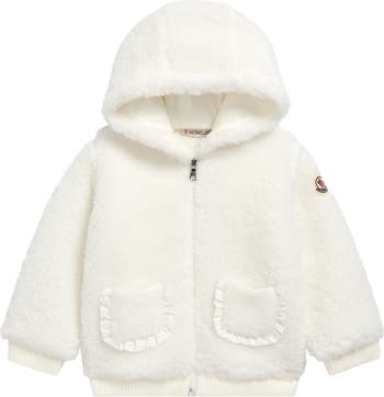 Silky ruffles at the patch pockets add to the considerable charm of this hooded jacket that wraps your little one in snuggly soft teddy fleece.