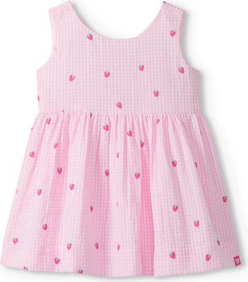 Lightweight cotton-seersucker keeps your little one feeling breezy as they twirl in this sweet gingham dress.