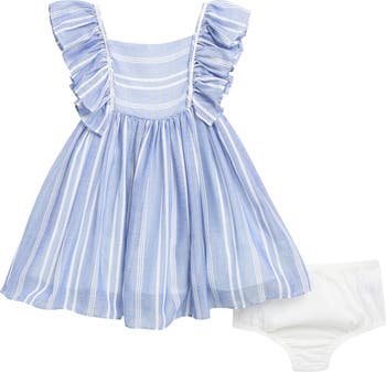 An adorable chambray dress with pretty ruffles, pom trim and variegated stripe is a comfy warm-weather outfit choice.